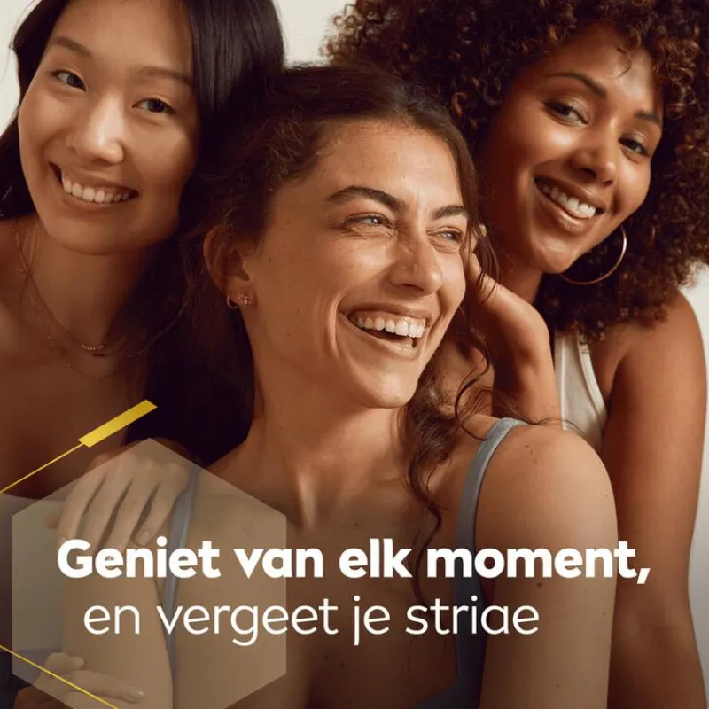 - Onmiddelijk glad huidgevoel op striae/striemen en hydrateert 48** uur lang