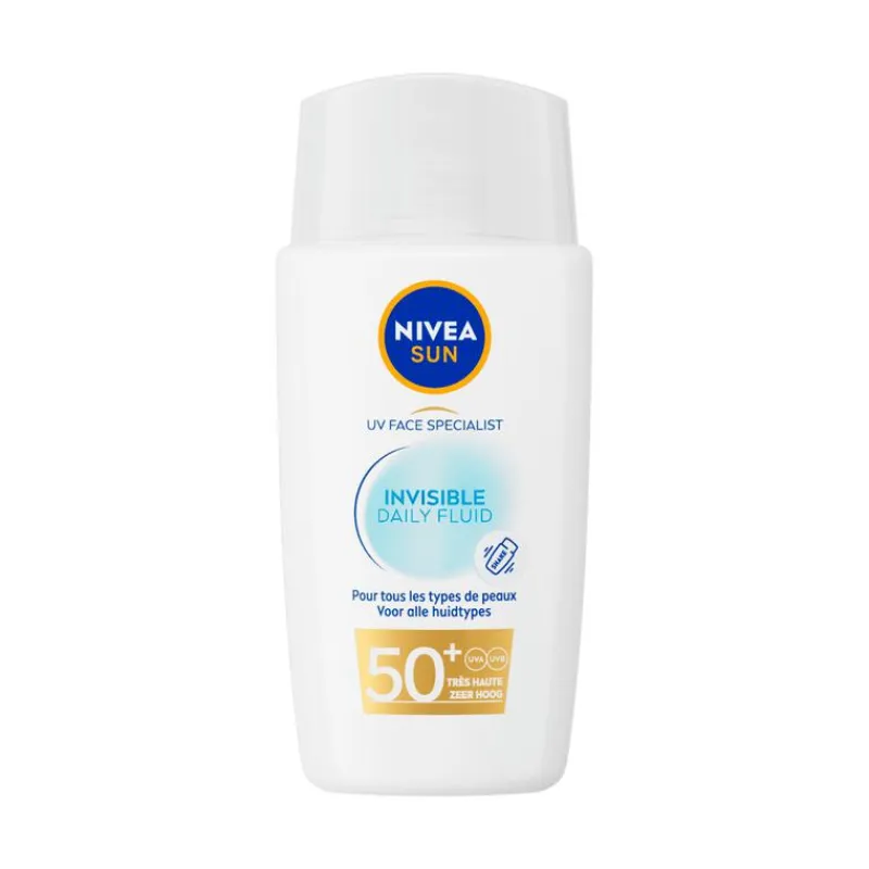 NIVEA SUN UV Face Invisible Daily Fluid SPF 50+ 40 ML. Deze ultralichte Zonnefluïde beschermt de huid van buitenaf tegen UVA/UVB-stralen en blauw licht, die verantwoordelijk zijn voor huidbeschadiging zoals vroegtijdige veroudering. Het beschermt de huid ook van binnenuit dankzij zoethoutextract. Deze natuurlijke antioxidant activeert het huideigen afweermechanisme om de cellen te beschermen en werkt tegen de effecten van vervuiling, zoals oxidatieve stress. De milde ultralichte Zonnefluïde met Niacinamide is niet vet, plakt niet en laat geen witte residuen achter. Het geeft 8 uur** lang een mat effect voor een niet-glimmende look. Laat de huid gehydrateerd aanvoelen en er gezond uitzien. Voor een optimaal resultaat schudden voor gebruik. Fles en dop gemaakt van 50% gerecycled plastic (label uitgezonderd). **Instrumentele test, 35 vrijwilligers.