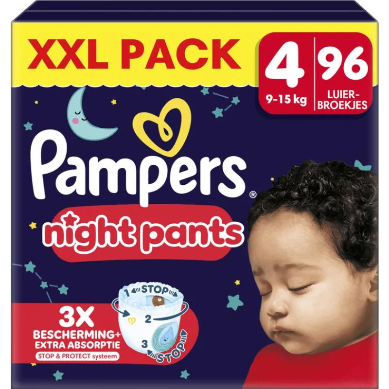 Geef je baby Pampers beste bescherming ’s nachts met Pampers Night Pants: door hun superabsorberende kern zijn ze het meest absorberende product van Pampers en bieden tot 100% lekvrije nachten! Ze hebben ook een 360° tailleband die zich aan de nachtelijke bewegingen van je baby aanpast en een Stop & Protect pocket die lekken aan de achterkant helpt voorkomen! Net als alle andere Pampers luierbroekjes zijn de Pampers Night Pants heel eenvoudig te verschonen, zelfs als je baby veel beweegt: je trekt ze in één beweging aan, scheurt de zijkanten open om ze uit te trekken, rolt ze op en gebruikt de plakstrip om ze weg te gooien.