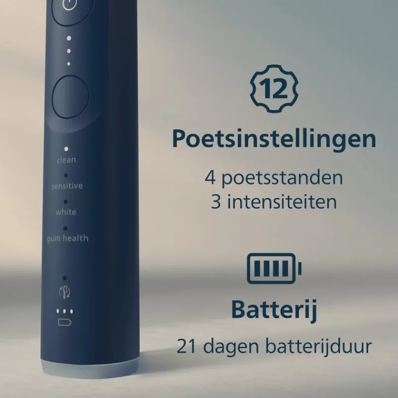 - Sonisch poetsen --> Met 62.000 borstelbewegingen per minuut wordt de tandpasta en vloeistof tussen de tanden door gestuwd, en reinig je zelfs moeilijk bereikbare plekken.