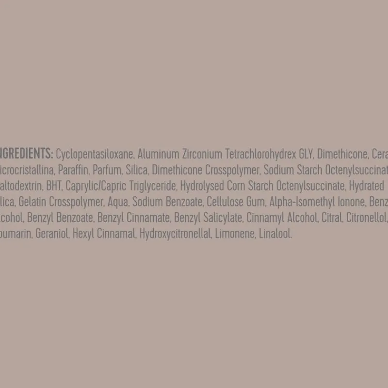 Cyclopentasiloxane, Aluminum Zirconium Tetrachlorohydrex GLY, Dimethicone, Cera Microcristallina, Paraffin, Parfum, Silica, Dimethicone Crosspolymer, Sodium Starch Octenylsuccinate, Maltodextrin, BHT, Caprylic/Capric Triglyceride, Hydrolysed Corn Starch Octenylsuccinate, Hydrated Silica, Gelatin Crosspolymer, Aqua, Sodium Benzoate, Cellulose Gum, Alpha-Isomethyl Ionone, Benzyl Alcohol, Benzyl Benzoate, Benzyl Cinnamate, Benzyl Salicylate, Cinnamyl Alcohol, Citral, Citronellol, Coumarin, Geraniol, Hexyl Cinnamal, Hydroxycitronellal, Limonene, Linalool.