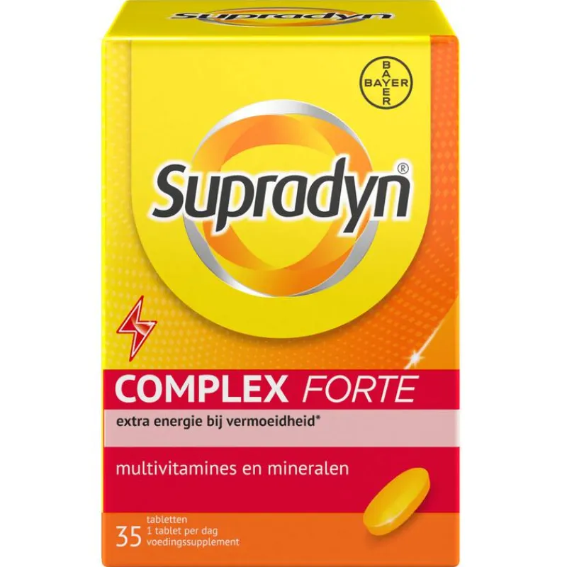 Sta actief in het leven! Supradyn Complex Forte geeft je als aanvulling op de voeding een steuntje in de rug tijdens veeleisende periodes waarin je de extra energie bij vermoeidheid goed kunt gebruiken**, zoals drukte op je werk, als je weerstand op de proef wordt gesteld, de combinatie werk/gezin. Neem als aanvulling op je dagelijkse voeding een hoog gedoseerde tablet van Supradyn Complex Forte. ; *De vitamines B2, B3, B5, B6, B12, C, het mineraal magnesium en het sporenelement ijzer activeren extra energie bij vermoeidheid. ; **Multiscope marktpeiler 2016 ; ***Vergeleken met Supradyn Complex Energy; ruim onder de maximaal veilige hoeveelheid.