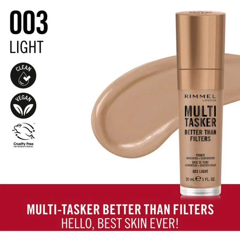 HELLO BEST SKIN EVER. BETER DAN WELKE FILTER DAN OOK: EEN PRACHTIGE GLOW OP JE MOOISTE HUID OOIT. Echte glow, beter dan een filter, op je mooiste huid ooit: met de 3-in-1 huidprimer, glowbooster en highlighter Multi-Tasker Better Than Filters! • Draag jouw glow op jouw manier met de Multi-Tasker Better Than Filters gezichtsprimer, glowbooster en highlighter: kan zonder jouw basismake-up aangebracht worden, maar ook gemengd met, onder of op jouw basismake-up • De vederlichte, gemakkelijk te blenden formule is verrijkt met natuurlijke biopeptiden, vitamine C en E. Je huid voelt goed doorvoed en gerevitaliseerd aan en ziet er in slechts 4 weken beter uit. • De lichtweerkaatsende pigmenten geven de huid een perfect stralende en zachte glow: social mediafilters heb je niet meer nodig • De Multi-Tasker Better Than Filters is verkrijgbaar in 8 op de huid afgestemde tinten en is dierproefvrij en vegan