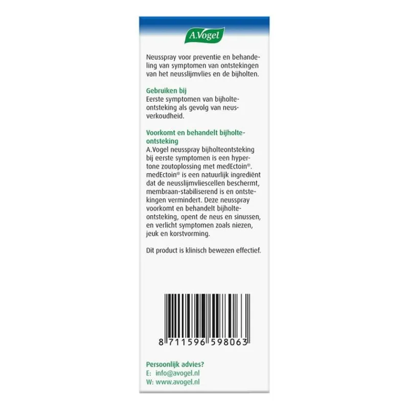 A.Vogel neusspray bijholteontsteking bij eerste symptomen is een hypertone zoutoplossing met medEctoin®.medEctoin ® is een natuurlijk ingrediënt dat de neusslijmvliescellen beschermt, membraan-stabiliserend is en ontstekingen vermindert. Deze neusspray voorkomt en behandelt bijholteontsteking, opent de neus en sinussen, en verlicht symptomen zoals niezen, jeuk en korstvorming. Dit product is klinisch bewezen effectief.