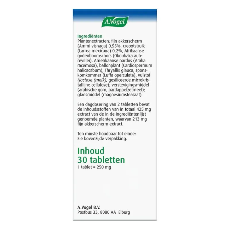 Ingrediënten: Fijn akkerscherm (Ammi visnaga) 0,55%, creootstruik (Larrea mexicana) 0,2%, Afrikaanse godenboomschors (Okoubaka aubrevillei), Amerikaanse nardus (Aralia racemosa), ballonplant (Cardiospermum halicacabum), Thryallis glauca, sponskomkommer (Luffa operculata); vulstof (lactose (melk), gesiliceerde microkristallijne cellulose); verstevig ingsmiddel (arabische gom, aardappelzetmeel); glansmiddel (magnesiumstearaat).