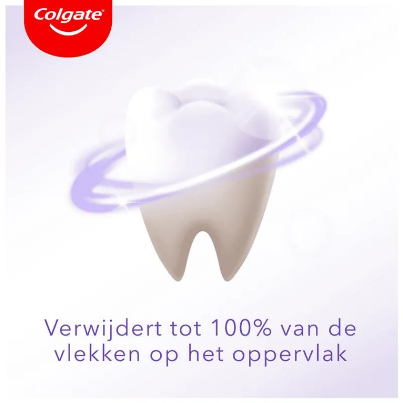 Ontdek de Purple tandpasta van Colgate die, geïnspireerd door de kleurwetenschap van paarse shampoos, de gele kleur van tanden direct* corrigeert. De Colgate Max White Purple Reveal whitening tandpasta zorgt door de optische kleurcorrigerende technologie al vanaf het eerste gebruik voor een direct* wittere glimlach. Het is klinisch bewezen dat deze tandpasta tot 100% van de vlekken veroorzaakt door eten en drinken verwijdert en veilig is voor het tandglazuur bij dagelijks gebruik. Onze paarse tandpasta bevat daarnaast fluoride, zodat je parelwitte tanden ook dagelijks worden beschermd tegen gaatjes. Laat deze populaire beauty trend niet aan je voorbijgaan en probeer onze Max White Purple tandpasta uit voor een direct* stralend witte glimlach!