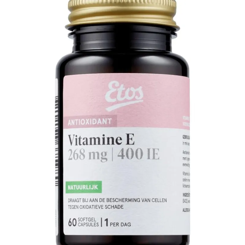 Etos Vitamine E 268 mg | 400IU capsules bevatten een hoge dosering vitamine E. Vitamine E levert een bijdrage aan de bescherming van gezonde cellen en weefsels en helpt het natuurlijk afweersysteem van de lichaamscellen.