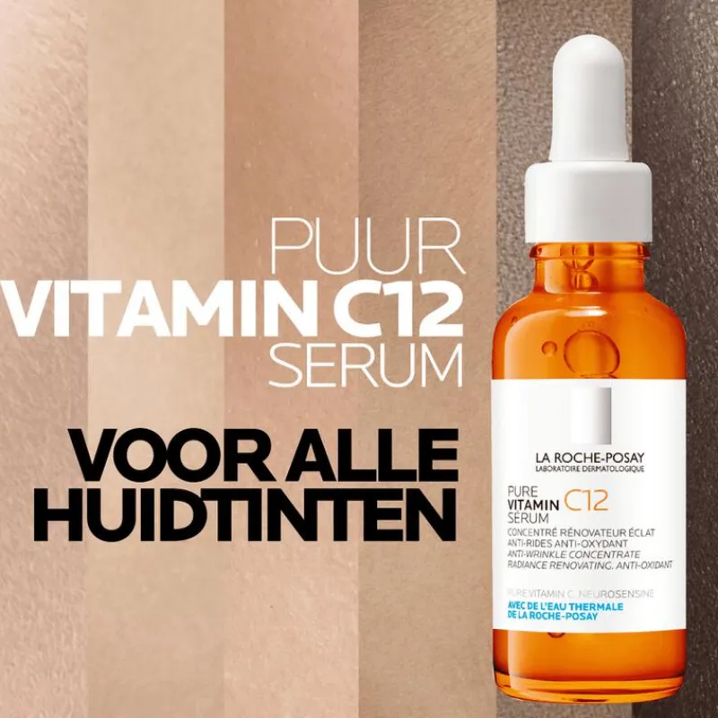 La Roche-Posay Pure Vitamin C12 Serum is een anti-aging gezichtsserum dat de natuurlijke huidvernieuwing ondersteunt verrijkt met 12% geconcentreerde vitamine C, salicylzuur en neurosensine. Deze gezichts- en halsverzorging kalmeert en verbetert de huid door rimpels, een doffe teint en een onregelmatige huidtextuur aan te pakken. De huid voelt onmiddellijk zachter en gehydrateerd aan. Het serum is geschikt voor alle huidtypes, in het bijzonder een gevoelige huid om deze opnieuw te laten stralen. De vederlichte, rijke textuur dringt snel in de huid en zorgt voor een niet-plakkerige, niet-vette finish. Het product is ook ideaal als make-up basis.