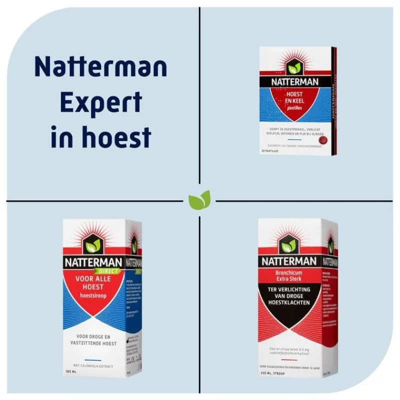 Natterman Droge hoest en Keelpijn 2in1 siroop met het actieve ingrediënt Polysac-ActiveTM voor de behandeling en preventie van droge hoest en verlichting van keelpijn. Polysac-ActiveTM, een op honing gebaseerd extract, creëert een beschermende filmlaag achter in de keel. Het verzachtende effect geeft snel een gevoel van verlichting van droge hoestsymptomen en keelpijn. De siroop beschermt de slijmvliezen tegen verdere irritatie. Door de keel te verzachten wordt de frequentie en ernst van de hoest verminderd en de hoestcyclus onderbroken.