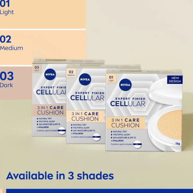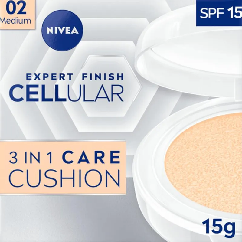 Egaliseer je teint en geniet van een ademend gevoel dankzij de innovatieve NIVEA Expert Finish CELLular 3in1 Care Cushion Foundation. Deze cushion foundation zorgt ervoor dat je huid een prachtige finish krijgt, zonder de natuurlijke teint te maskeren. De formule smelt samen met de huid en geniet van een natuurlijke, jeugdige glow. Tegelijkertijd wordt de huid 24 uur lang gehydrateerd en geniet je van de bescherming die SPF 15 biedt. Elke touch-up geeft je onmiddellijk een fris uitziende huid die zacht en glad aanvoelt.NIVEA Expert Finish CELLular 3in1 Care Cushion maakt niet alleen oneffenheden minder zichtbaar. Zo is de cushion foundation ook verrijkt met hyaluronzuur. Deze stof zorgt voor intensieve hydratatie van de huid. Tegelijkertijd geniet je van een natuurlijke boost collageen, waardoor je huid steviger en veerkrachtiger aanvoelt. Gebruik deze NIVEA CELLular filler foundation dan in combinatie met de NIVEA 3in1 Concealer Medium. • Egaliseert de teint op een natuurlijke manier• Hydrateert de huid tot 24 uur lang• Verrijkt met hyaluronzuur en collageenbooster• Met SPF 15• Met cushionpad en spiegel