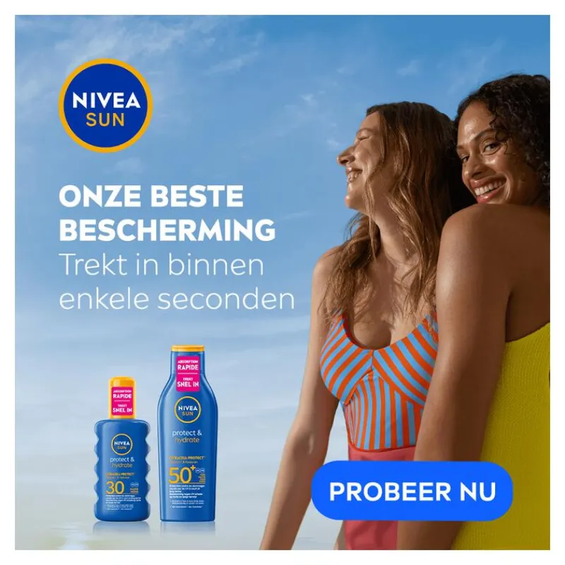 Zorg voor je huid met de vernieuwde NIVEA SUN Protect & Hydrate Zonnemelk SPF30. Deze zonnemelk biedt betrouwbare UVA/UVB-bescherming tegen UV-schade, zowel op korte als lange termijn. Dankzij de innovatieve CitraCell-ProtectTM-formule met vitamine C en hyaluron creëert het een tweede beschermingslaag voor je huid, waardoor je optimaal beschermd bent. De lichte formule trekt sneller in en is gemakkelijk uit te smeren zonder een vettig gevoel of wit residu achter te laten.De hydraterende werking zorgt ervoor dat je huid tot wel 48 uur* zacht en gehydrateerd blijft, waardoor je huid er gezond en soepel uitziet, zelfs tijdens zonnige dagen. Of je nu een zonnebrandcrème gezicht zoekt, een zonnemelk voor dagelijks gebruik of een betrouwbare optie naast je zonnebrand spray, deze zonnemelk is een ideale keuze. Het product combineert effectieve zonbescherming met een ultiem huidcomfort.Perfect te combineren met je favoriete aftersun voor een complete zonverzorgingsroutine. *Instrumentele test, 43 vrijwilligers