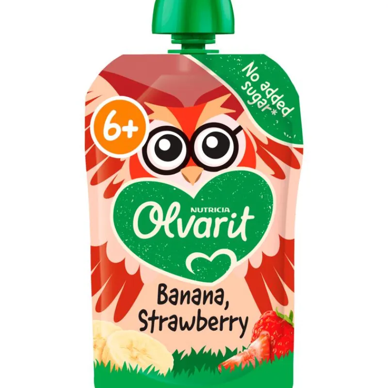 Olvarit Knijpfruit Banaan Aardbei, geschikt voor baby’s vanaf 6 maanden oud.