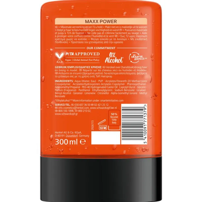 Taft Maxx Power Styling Gel voor maximale sterkte. Het geeft je haar tot 72 uur fixatie. Deze gel plakt niet, is gemakkelijk uit te wassen en is vrij van alcohol (ethylalcohol).