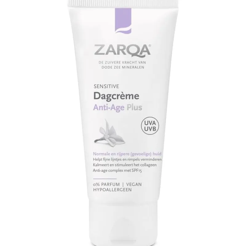 ZARQA Dagcrème Anti-Age Plus – met anti-age complex en SPF15 – is een rijke dagcrème, die de rijpere (gevoelige) huid intensief beschermt, voedt en helpt bij het verminderen van tekenen van huidveroudering. Dode Zee mineralen,shea butter, magnesium en hydrocomplex met hyaluronzuur ondersteunen de ouder wordende huid. De crème stimuleert het collageen en beschermt actief tegen huidveroudering en schadelijke invloeden van buitenaf, zoals UVA/B-straling. Het helpt fijne lijntjes en rimpels verminderen, de huidtextuur verbeteren en verstevigen en hyperpigmentatie verminderen. De crème heeft een kalmerend effect op de huid en bevordert een gelijkmatige teint.