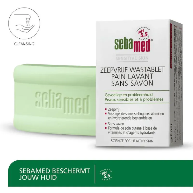 Met de Zeepvrije Wastablet van Sebamed ga je voor een stukje nostalgie. Wie had er vroeger nu niet een lekker stuk zeep in huis,maar dan zonder de nadelen van zeep. De Zeepvrije Wastablet reinigt het gezicht, handen en lichaam tot diep in de poriën en het beschermt de huid tegen invloeden van buitenaf.Daarbij is het product zeer effectief bij acné, puistjes, mee-eters en zeepallergie. De huidneutrale pH-waarde van 5,5 versterkt de natuurlijke beschermingslaag van de huid. Zo blijft de huid gezond en in topconditie. Ontwikkelt door en met dermatologen. Dermatologisch/klinisch getest.