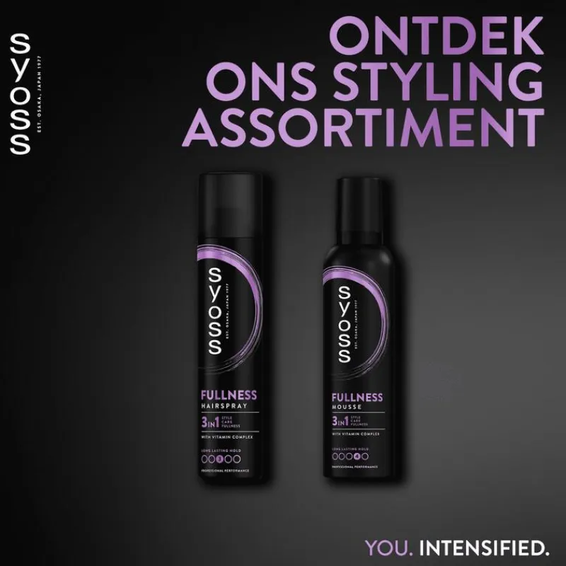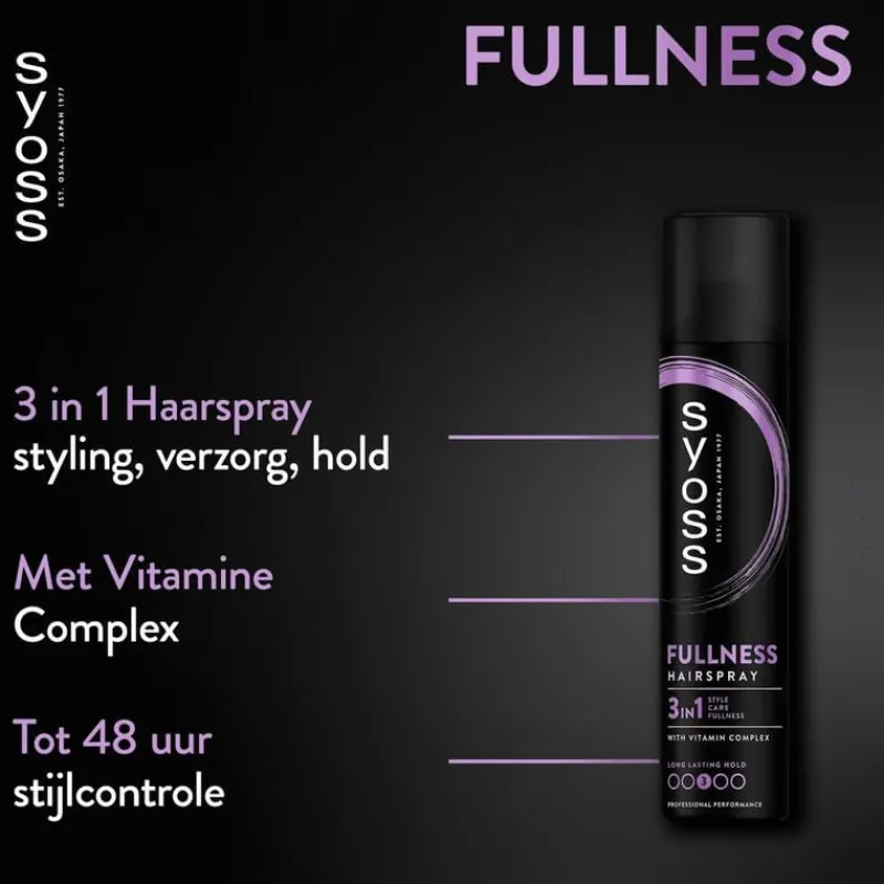 - lon- geïnspireerde Syoss Fullness Haarspray, ontwikkeld met en getest door kappers, zorgt voor een directe transformatie van dun en fijn haar in een volle hairstyle – voor volumineuze salon looks thuis.