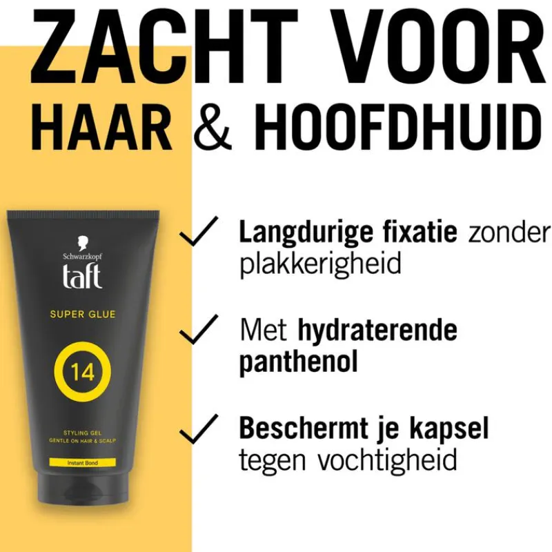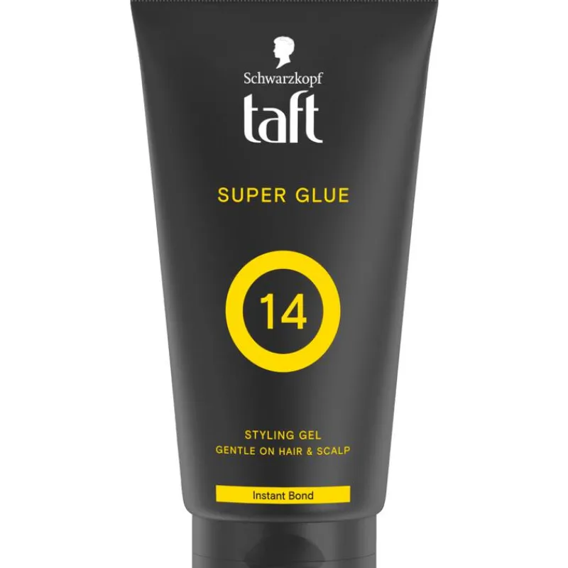 Taft Super Glue Styling Gel met instant bond-technologie geeft je haar een onmiddellijke en sterke hechting, maar plakt niet. De gel is gemakkelijk uit te wassen en is vrij van alcohol (ethylalcohol).
