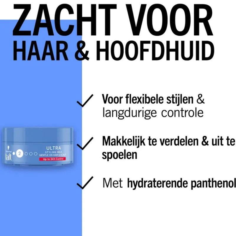 Taft Ultra Styling wax geef je haar tot 24u hold en structuur met een licht glanzende finish, zodat je er op alle momenten van de dag op kan vertrouwen dat je haar goed zit.