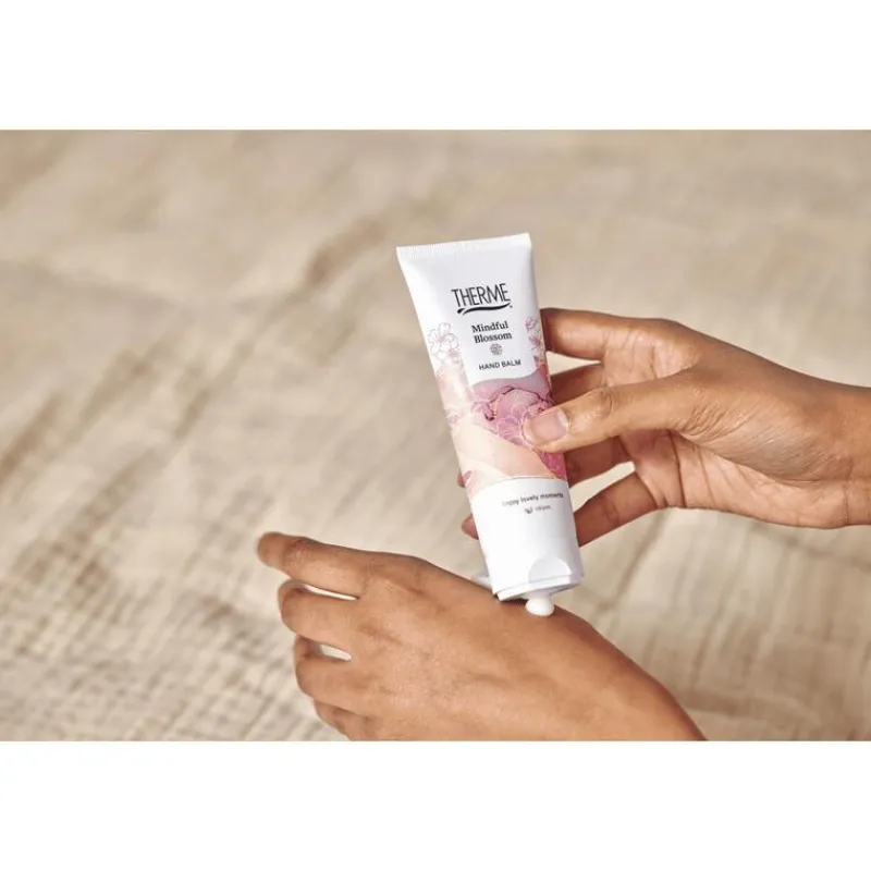 Therme Mindful Blossom Hand Balm is een luxe balsem die de handen hydrateert, verzorgt en langdurig parfumeert. De balsem smeert makkelijk uit, trekt snel in en laat een verzorgend laagje achter op de huid. Geniet van de verfijnde geur van bloesem en pioenroos gecombineerd met delicaat lentefruit en een vleugje cederhout.