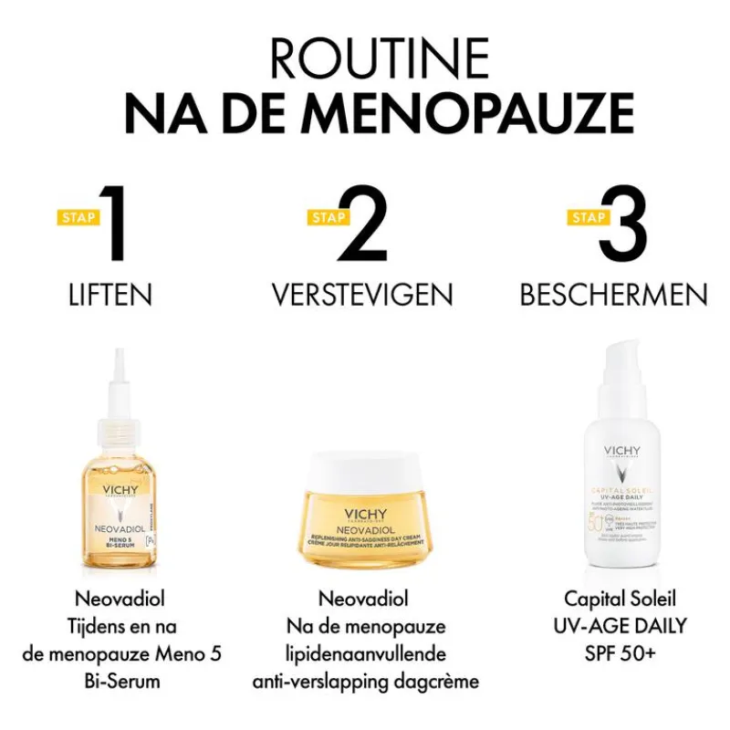 De Lipidenaanvullende Anti-Verslapping na de overgang Dagcrème van Neovadiol is bedoeld voor vrouwen na de overgang wiens huid door veroudering slapper, droger en oncomfortabel is geworden. Het vult verloren lipiden aan, verbetert de vorming van rimpels en verstevigt de huid.
